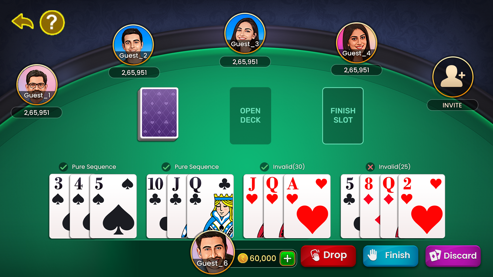 - Players must form valid sets and sequences with their cards. A valid sequence is a group of three or more consecutive cards of the same suit (e.g., 5♠ 6♠ 7♠). A valid set is a group of three or four cards of the same rank but different suits (e.g., 3♠ 3♥ 3♦).