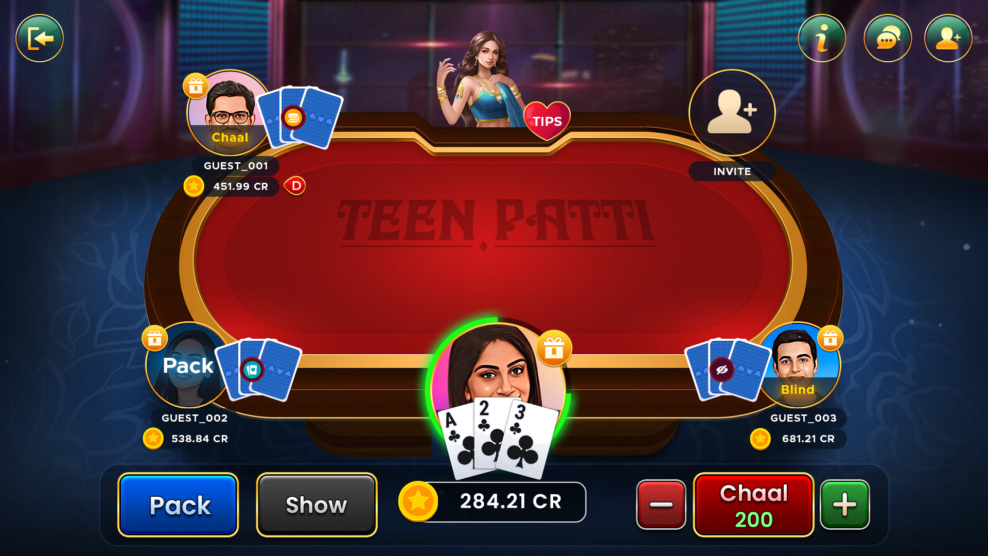 Betting Rounds: Teen Patti consists of several betting rounds where players can check (bet nothing), bet, call (match the current bet), raise (increase the bet), or fold (discard their hand and forfeit the round).